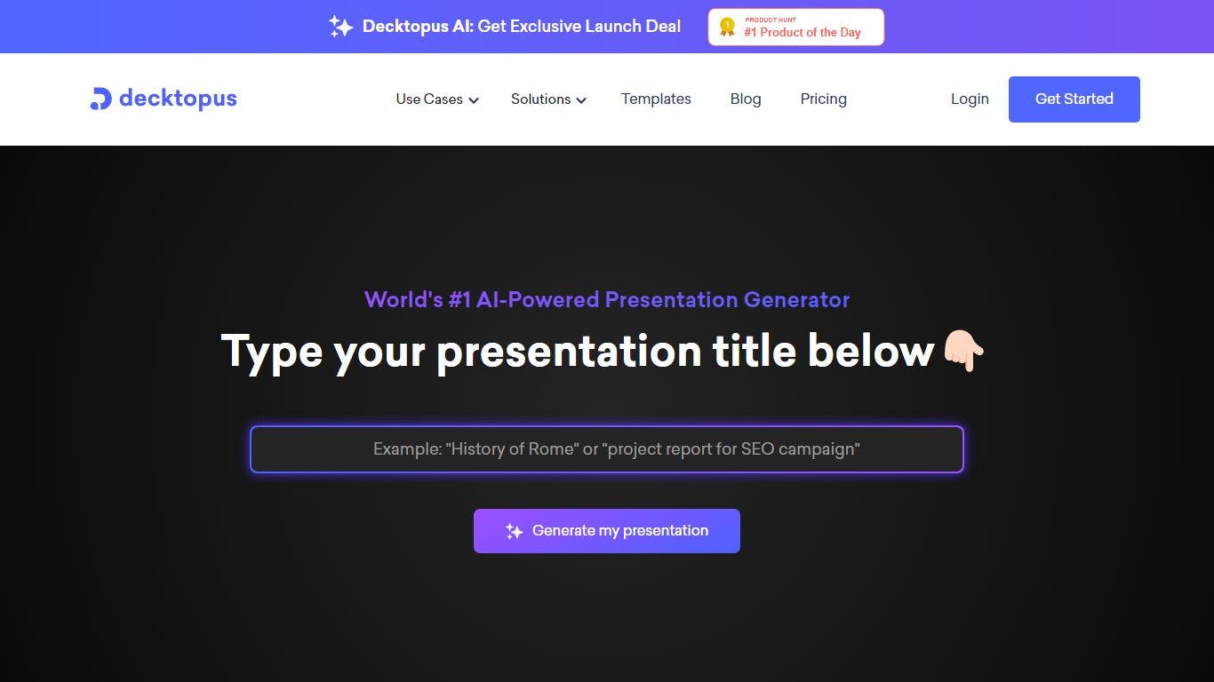 ð¯ Decktopus AI solves this problem by using the beloved AI to generate on-demand presentations tailored to your aim and audience. You can easily customize your deck, and generate additional bullet points, slide notes, and icons with a magic button to make it 100% your own.