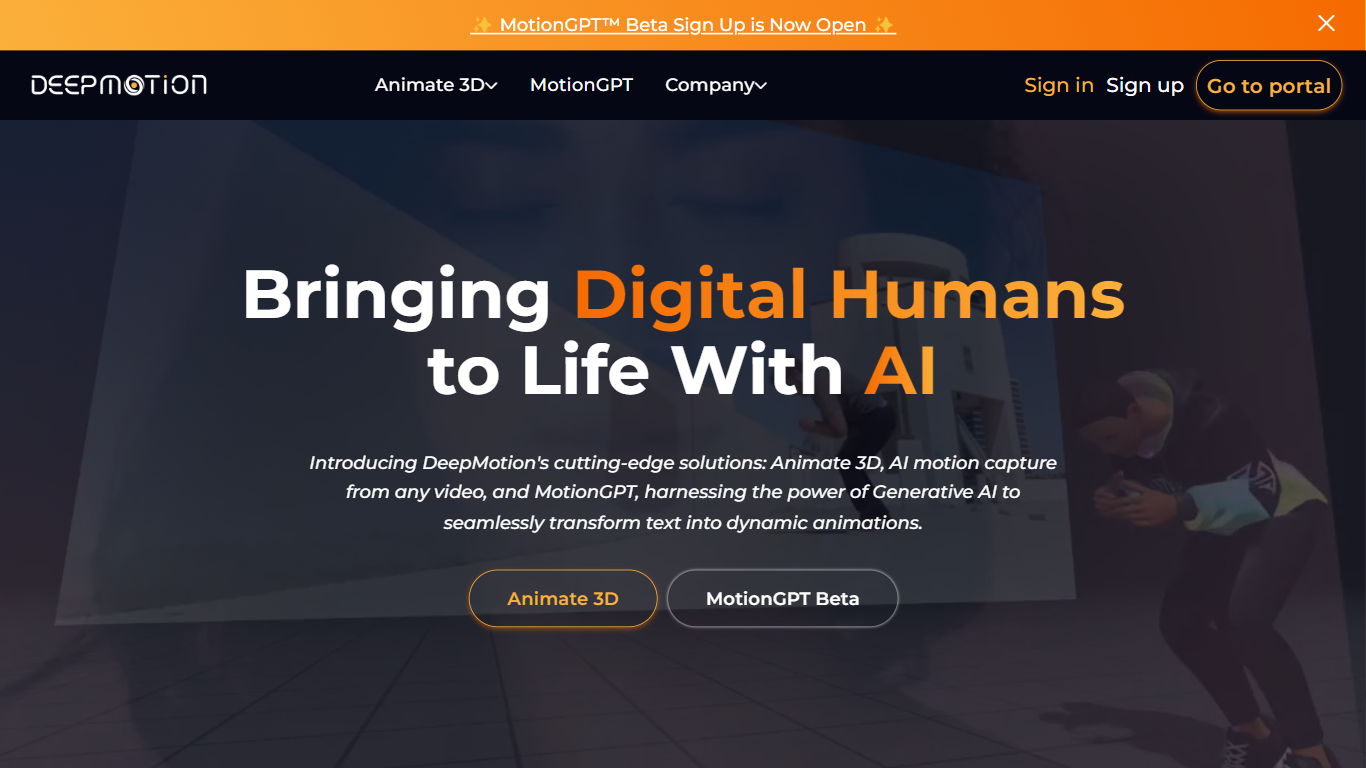DeepMotion is a cutting-edge AI company that specializes in bringing digital humans to life. They offer two innovative solutions: Animate 3D, which allows users to capture motion from any video using AI, and MotionGPT, a powerful tool that transforms text into dynamic animations. With DeepMotion’s technology, professionals and creators can easily create realistic and engaging animations for games, virtual reality, and more. Their products have received rave reviews for their speed, accessibility, and quality, making them essential tools for anyone in need of motion capture or animation.