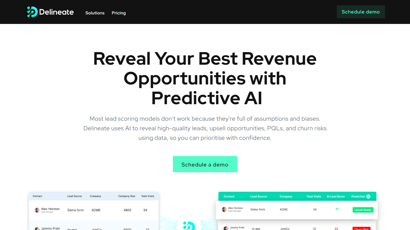 Discover the power of AI with Delineate, the predictive analytics tool transforming revenue opportunities. Our AI-driven approach outperforms traditional lead scoring models by eliminating biases and assumptions, allowing your sales team to focus on leads that truly matter. Delineate goes beyond just identifying quality leads; it also reveals upsell opportunities, Product-Qualified Leads (PQLs), and potential churn risks. Harness the ultimate efficiency with our workflow automation, integrating with over 300 platforms for seamless transitions from insight to revenue. Propel your product-led growth by connecting multiple data sources and pinpointing users ready to upgrade or expand their accounts. With Delineate, you can expect increased conversion rates, maximized deals, and optimized ad campaigns while reducing customer acquisition costs and churn rates – all contributing to a healthier return on ad spend (ROAS). Embrace the future of sales prioritization with Delineate and schedule a demo today to unlock your data’s full potential.