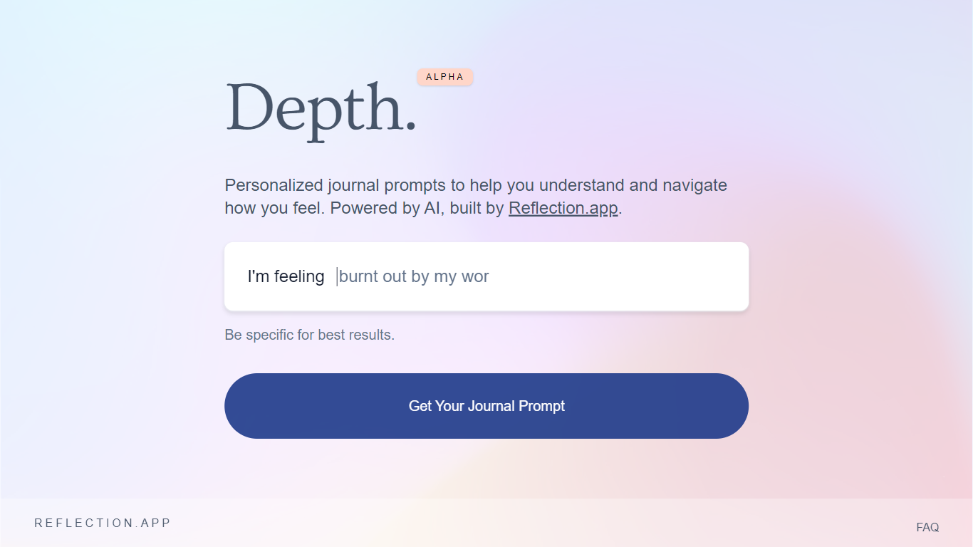 Reflection.app also ensures your journaling journey is supported with a robust FAQ section and clear Terms of Service. Start your self-exploration today by visiting Depth and receiving your personalized journal prompt!