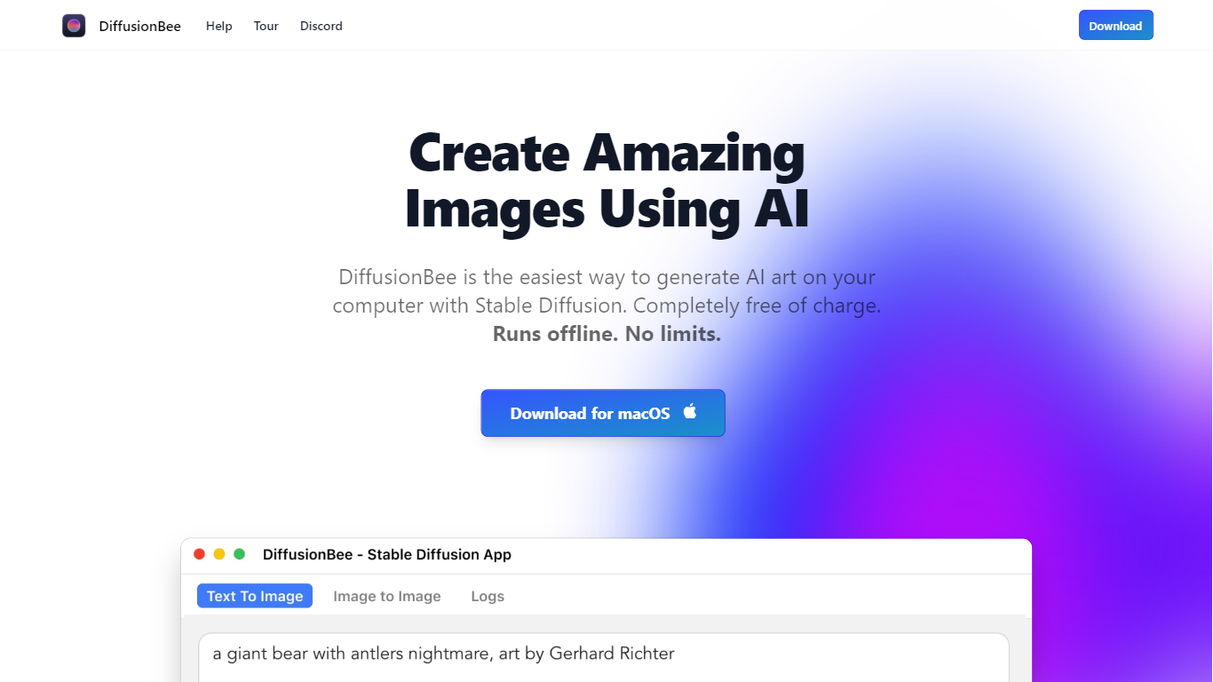 DiffusionBee is an AI tool that allows you to create amazing images using Stable Diffusion technology. It provides cutting-edge features for generating AI art right on your computer. With DiffusionBee, you can easily generate AI art from text prompts, modify existing images, add/remove objects, expand images, upscale resolution, use custom models, and more. The best part is that it runs offline, has no limits, and is completely free of charge. Download DiffusionBee for macOS and start creating stunning AI art today.