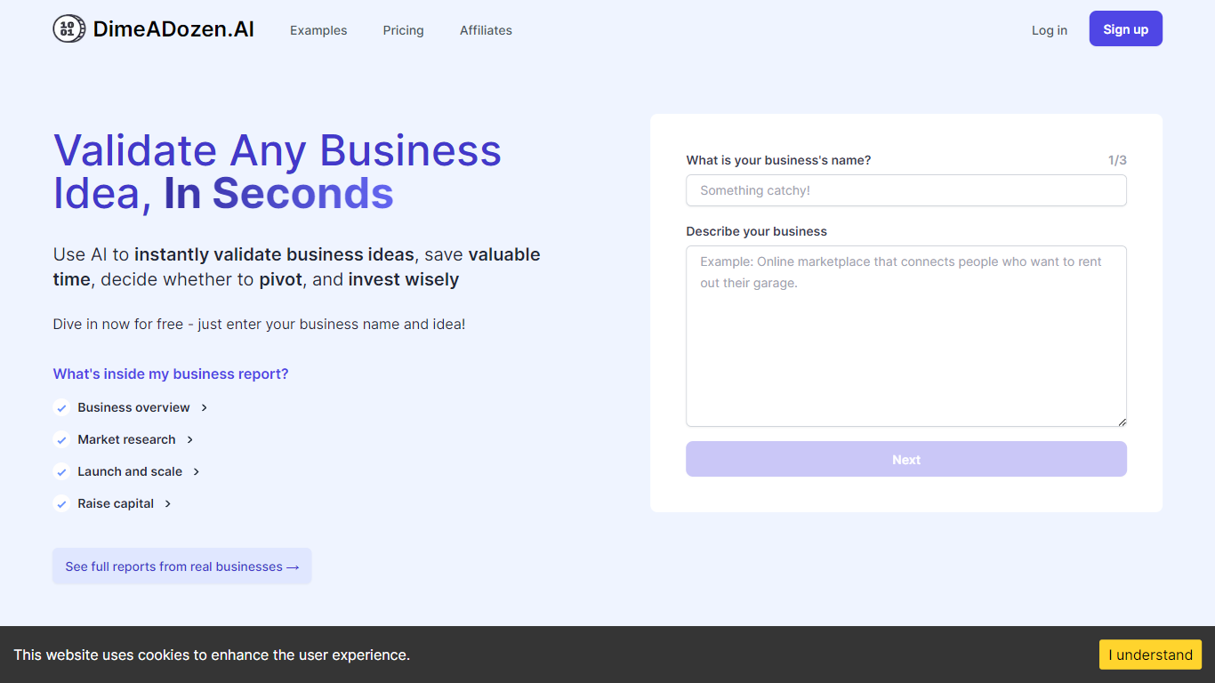 If you’re an entrepreneur or involved in a startup, verifying the potential of your business concept is crucial before committing significant resources. DimeADozen.ai specializes in AI-powered business validation, making it an indispensable tool for new ventures. The platform offers a plethora of services, including instant business idea validation to ensure that entrepreneurs focus on concepts with substantial market potential. Users are provided with comprehensive business reports covering market research, launch strategies, capital raising guidance, and more, all generated in under 60 seconds. Furthermore, the AI offers insights for smart pivoting, competitive analysis, and audience capture, essential for adapting and thriving in today’s dynamic market. Embrace the support of AI Business Advisors with DimeADozen.ai and transform your business ideas into actionable plans with confidence.