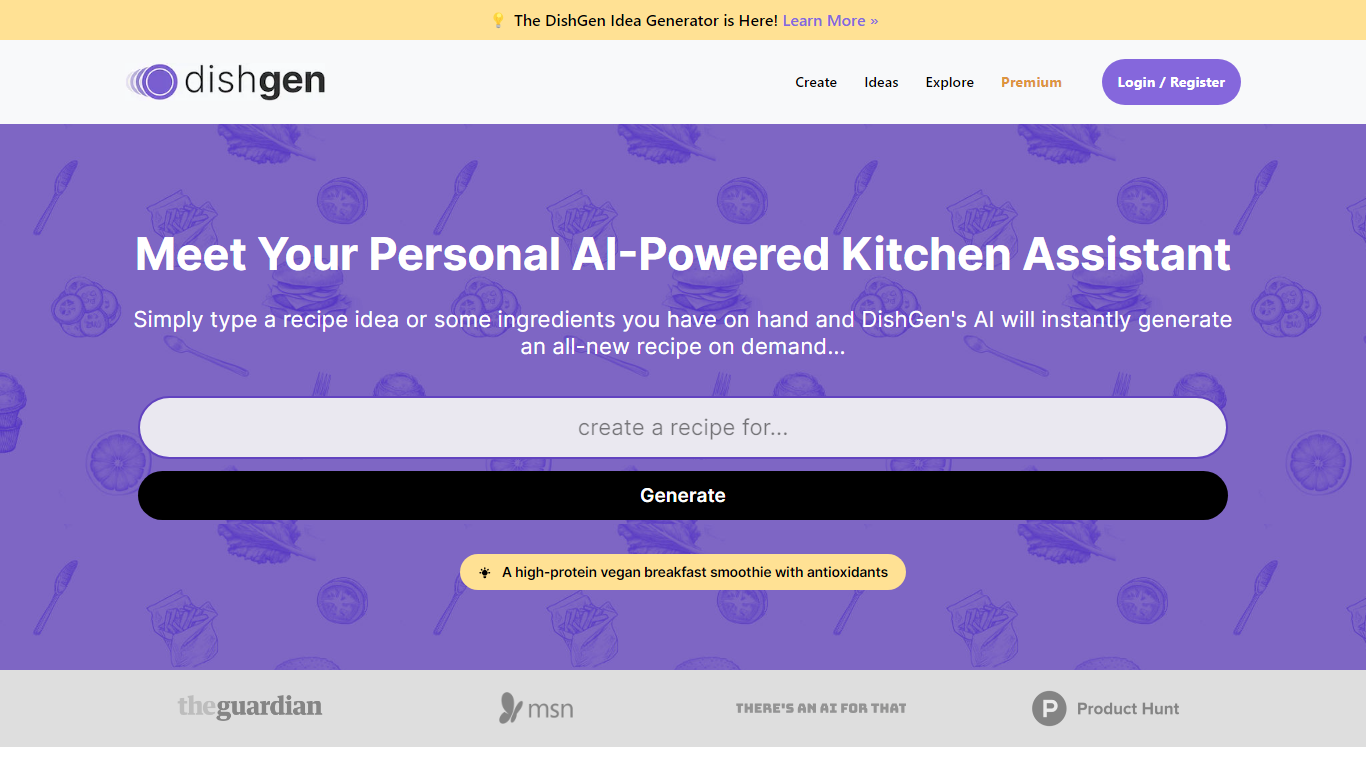 Discover the future of culinary innovation with DishGen, the ultimate AI-powered recipe generator that transforms your recipe ideas and available ingredients into unique and custom-tailored recipes. Whether you’re a home cook looking to explore new flavors or simply aiming to reduce food waste and save money, DishGen is your personal kitchen assistant, ready to offer limitless recipe possibilities at your command. With features like the Idea Generator and the ability to modify recipes in real-time, meal planning becomes an effortless and creative endeavor. Sign up for a free account to start crafting your AI-generated recipes, or go premium for the full, ad-free experience with endless customization options.