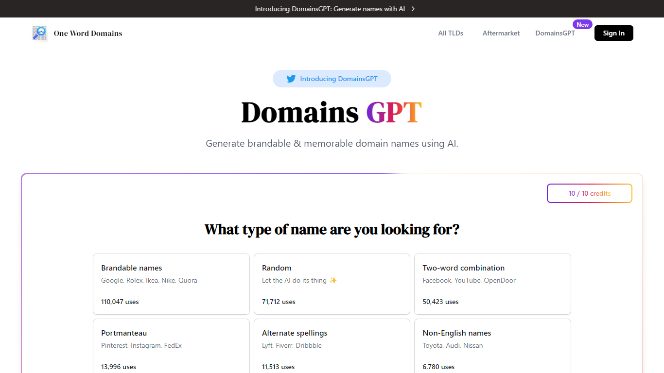 Welcome to DomainsGPT – the innovative platform using AI to revolutionize the way you create domain names. Whether you’re starting a new business or looking to rebrand, DomainsGPT offers a smart solution to generate brandable, memorable domain names tailored to your needs. With over 2 million names already crafted, our tool is trusted and celebrated by a sprawling community of satisfied users.