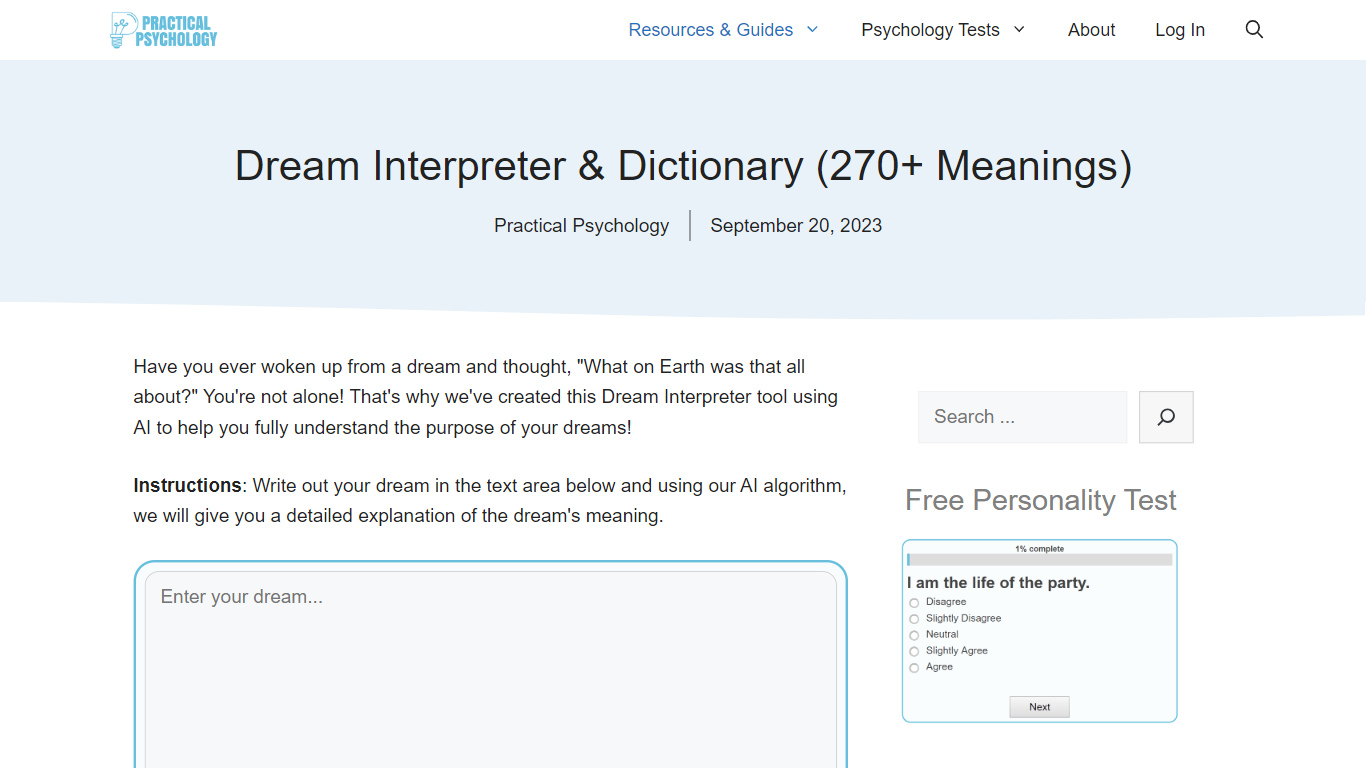 Unlock the mysteries of your subconscious with PracticalPsychology’s Dream Interpreter & Dictionary! Our unique platform allows users to dive deep into their nocturnal narratives, shedding light on the hidden messages behind every dream. Simply type in the details of your dream, and our advanced algorithm will provide a comprehensive report of your dream for self-reflection.