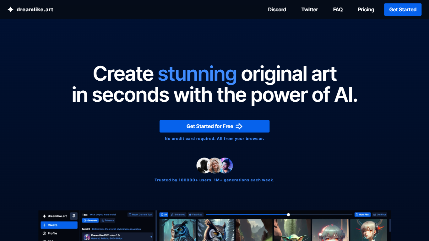 Dreamlike.art offers a free AI art generator and art maker that allows users to create stunning original art in seconds. With the power of AI, users can access a range of powerful AI tools to create, upscale, edit, fix faces, and make variations to their artwork. The platform runs on server-grade A100 GPUs, ensuring blazing-fast generation speeds. Everything you need is accessible from your browser, eliminating the need for confusing colabs, slow local installs, or chaotic discord bots. Trusted by over 100,000 users and generating over 1 million creations each week, dreamlike.art is a reliable and hassle-free solution for AI-generated artwork.