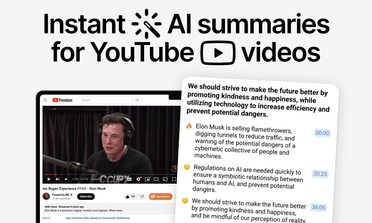 AI summaries for YouTube. Turn any long YouTube video into a Summary with 8 key ideas. Now you can instantly decide if the video is worth watching. Perfect for ð©âð¼business education, ðpodcasts, ðºinterviews, ð°news, and ð¨ð»âð«lectures!