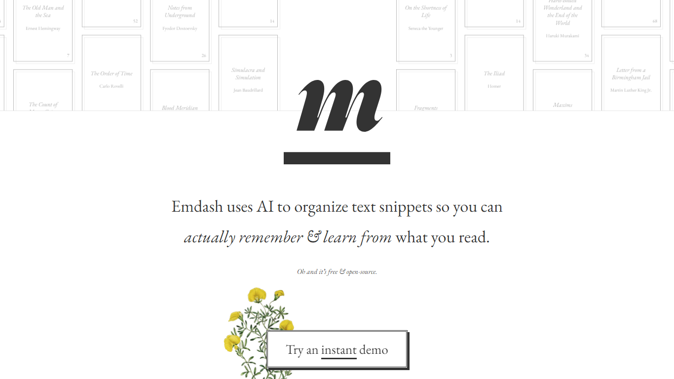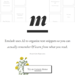 Unlock the full potential of your reading with Emdash, the AI-powered tool designed to organize and enhance your book highlights. Emdash’s intuitive system enables you to not only remember the information you read but also to learn from it in a meaningful way. The software provides advanced features such as ‘Conceptual Cousins’, which locates similar ideas from different authors, offering you varied perspectives. Dive into your saved highlights with ‘Instant Semantic Search’ that goes beyond mere text matching, connecting the dots between complex thoughts.