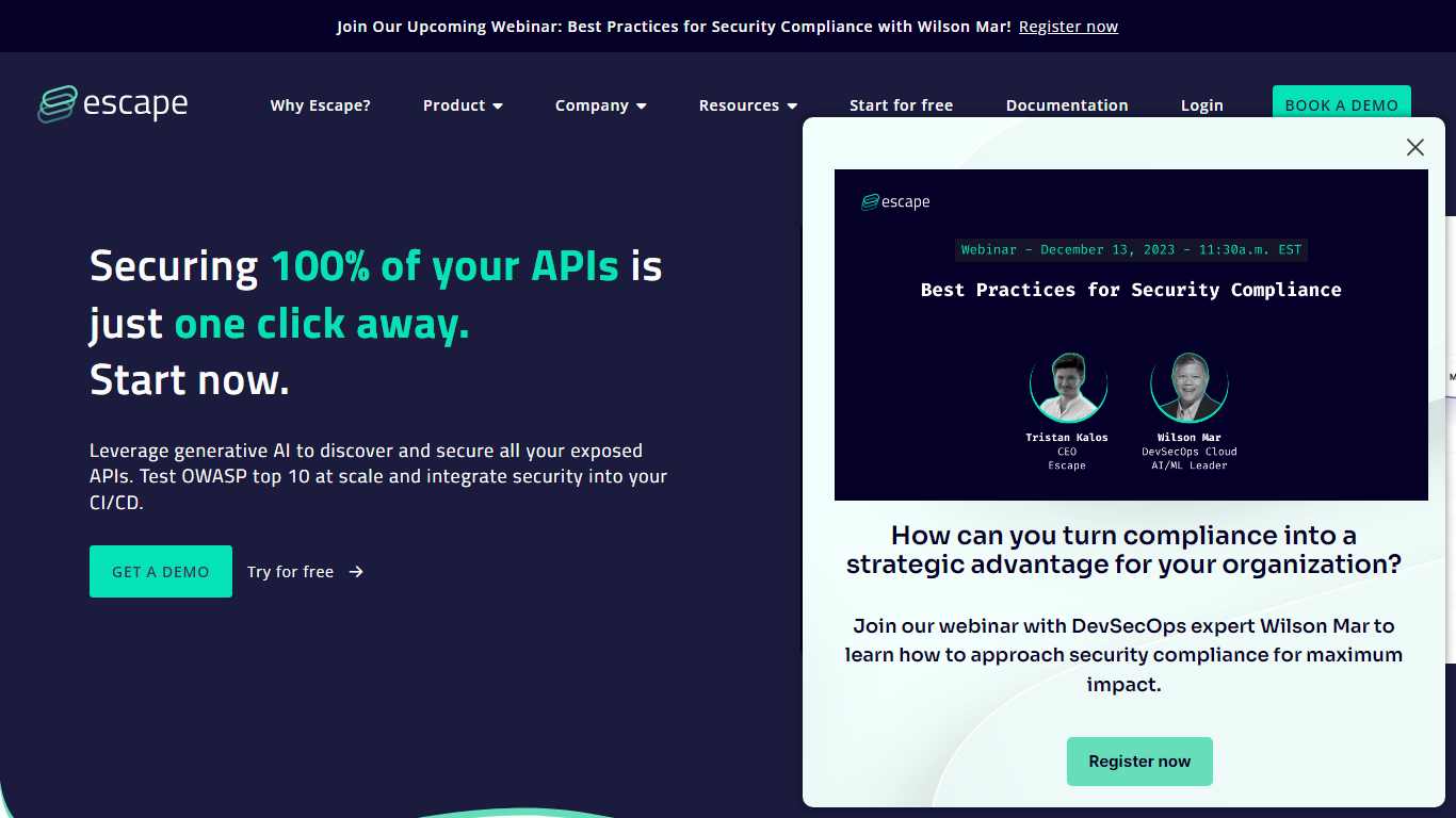 Discover the revolutionary approach to API security with Escape—your all-in-one solution seamlessly integrating API inventory management, security testing, and business logic testing directly into your CI/CD processes. Escape stands at the forefront of API security by offering a suite of tools designed for quick integration and tailored remediations that align with business priorities. Key offerings include the unique Feedback-Driven Exploration Technology and Automated Remediation for DevSecOps, ensuring that your team can focus on building secure applications with confidence. Unlock the power of an API Security solution trusted by industry experts and liked by developers who value performance and precision. Experience the ease of plug-and-play functionality with low false positive rates and the ability to test the OWASP top 10 at scale—without the need for external agents or excessive traffic.