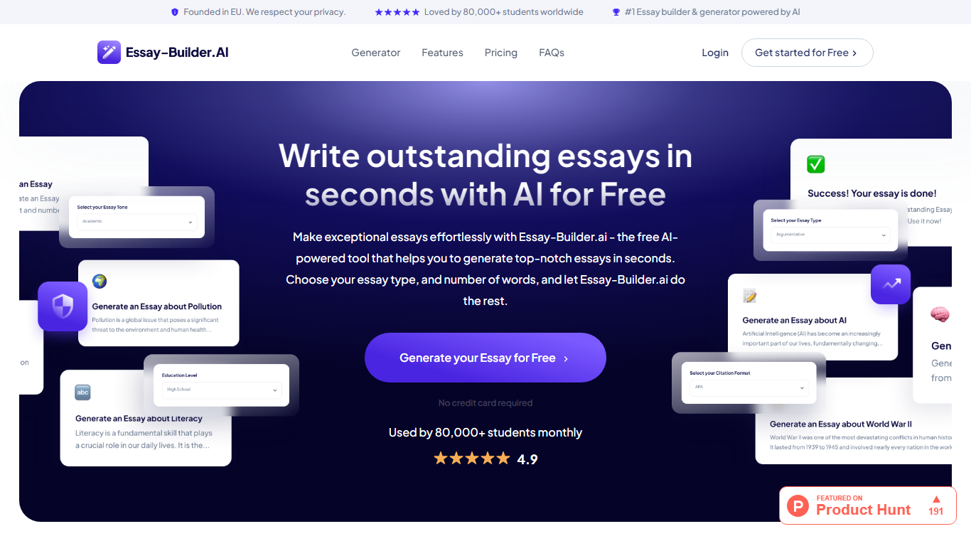 Achieve academic excellence with Essay Builder AI, the ultimate free AI-powered essay generator praised by over 80,000 students worldwide. Our EU-founded platform guarantees privacy and efficiency, enabling you to create top-notch essays in mere seconds. Select your desired essay type and word count, and let our advanced AI technology craft a plagiarism-free, well-structured essay that’s tailored to your needs. Whether you’re tackling an exam format or a standard essay, our tool is designed for all academic levels. Scaling the heights of superb writing has never been easier—get started for free today!