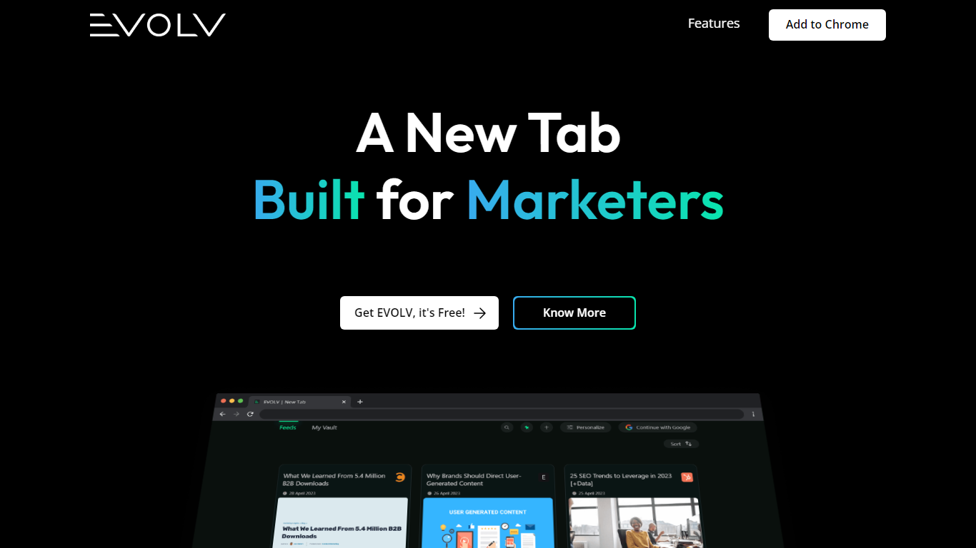 Transform the way you engage with the world of marketing with EVOLV, your one-stop New Tab page that refines and delivers the most relevant updates directly to you. Our features are meticulously designed with marketers in mind, ensuring you always stay a step ahead in the fast-paced marketing arena.