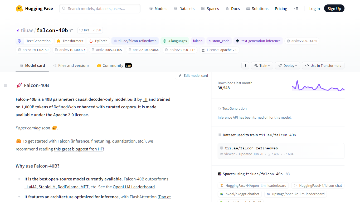 Unlock the Power of AI Language Modeling with Falcon-40B – The next-generation artificial intelligence model designed for diverse text generation tasks. Falcon-40B, built by TII and accessible via Hugging Face, features an astonishing 40 billion parameters, setting new benchmarks in the field of AI language models. Its profound training on 1,000 billion tokens from the RefinedWeb dataset, combined with curated corpora, ensures its capabilities span across multiple languages including English, German, Spanish, French, and others. Not only does Falcon-40B shine with its text-generation prowess, but it also comes with a flexible Apache 2.0 license, supporting both open-source community projects and commercial endeavors. Whether you’re delving into research, seeking a solid foundation for app development, or exploring fine-tuning for specific tasks-be it chatbots, summarization, or custom content creation-Falcon-40B promises to deliver state-of-the-art performance tailored to your requirements.