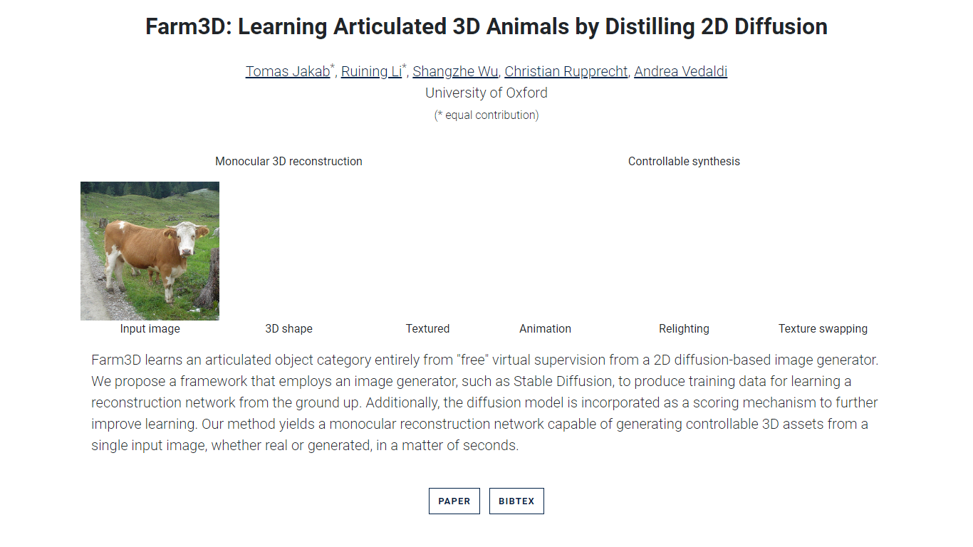Unlock the potential of 3D animal modeling with Farm3D, a revolutionary approach to creating articulated 3D animals through the distillation of 2D diffusion techniques. Developed by experts at the University of Oxford, Farm3D offers a novel method for single-view 3D reconstruction, allowing the creation of detailed 3D shapes from a single input image. With the aid of an innovative controllable synthesis process, users can generate 3D models that are not only accurate but also customizable in terms of animation, texture, and lighting.