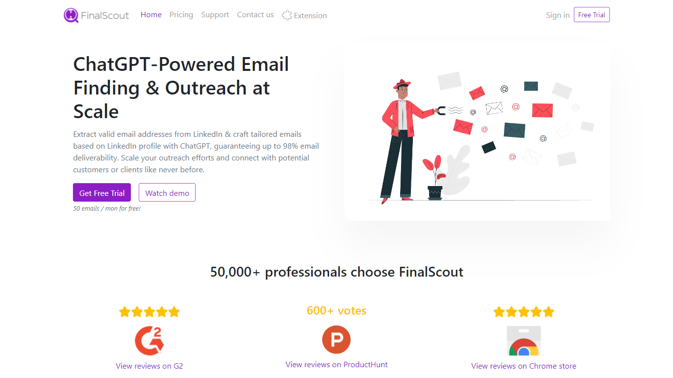 Boost your professional networking with FinalScout, the premier tool for effortlessly finding professional email addresses. Extract up to 50 emails per month absolutely free and scale your email outreach with a staggering 98% deliverability rate. Thanks to the integration with ChatGPT, FinalScout enables you to create personalized outreach emails based on LinkedIn profiles, making the whole process seamless and highly targeted.
