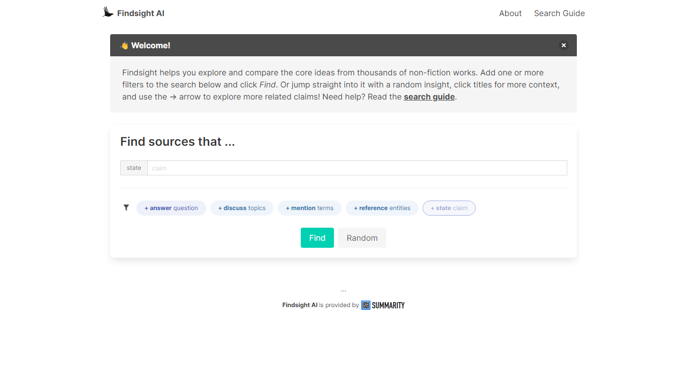 Welcome to Findsight AI, your gateway to a vast expanse of knowledge from non-fiction literature. Unearth and juxtapose the fundamental insights from a multitude of literary works, curated meticulously for your learning expedition. With Findsight AI, you initiate your journey through a user-friendly interface, leveraging filters to direct your search with unmatched precision.