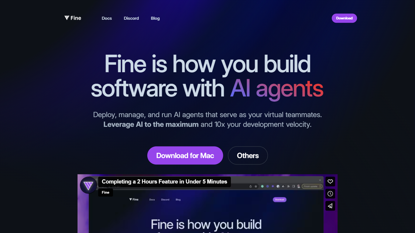 Fine is where you build software with AI agents. By facilitating AI agents, Fineâs platform allows developers to create their own squad of virtual teammates, and 10x their development speed. While coding assistants like GitHub Copilot focus on the next few lines of code, you can delegate complete tasks to Fine’s agents.