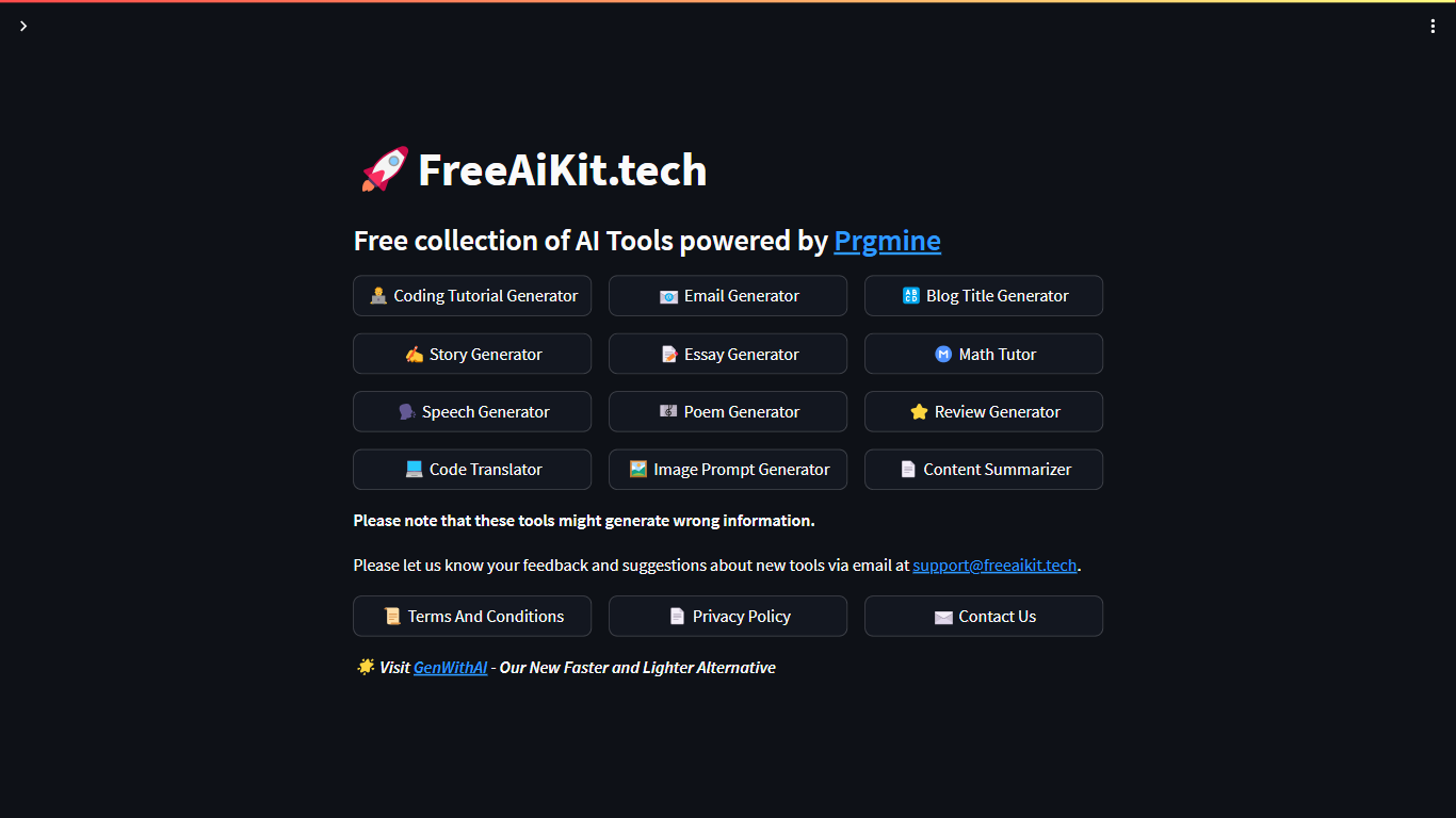 FreeAiKit offers a collection of AI Tools like Math Tutor, Story Generator, Poem Generator, and more. Generate content easily with our free AI-powered tools. Easily generate coding tutorials with our AI-powered tool. Saves time and effort for developers and learners. Generate professional and personalized emails instantly with our AI-based Email Generator. Perfect for busy professionals.