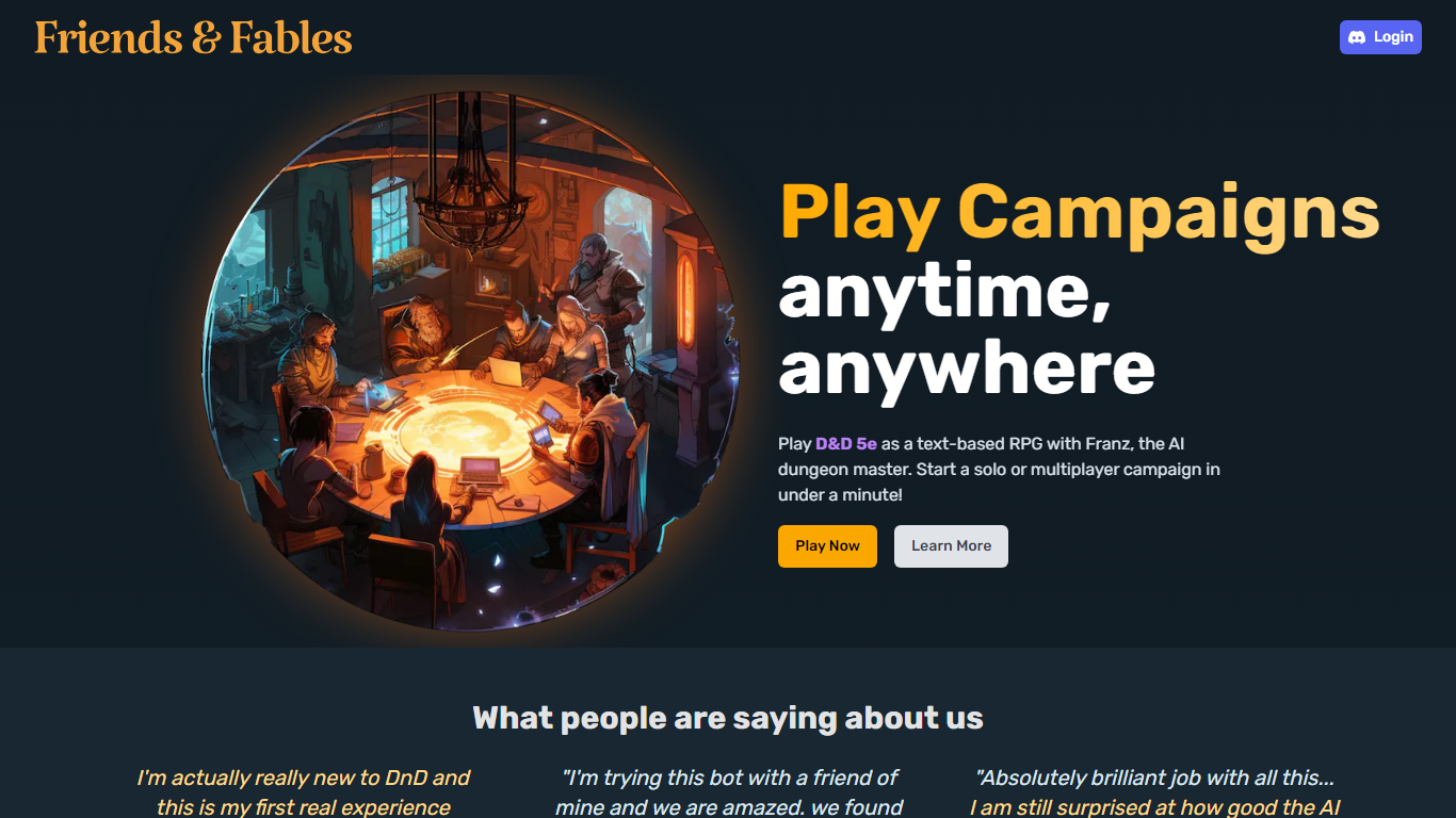 Listen to what other players have to say – testimonials rave about the multilingual capabilities, the novelty of the experience, and the quality of the AI compared to others. It’s not just a game; it’s a doorway to limitless storytelling and friendship. Friends & Fables is an innovation in RPG gaming, allowing you to explore new worlds and experience D&D like never before.