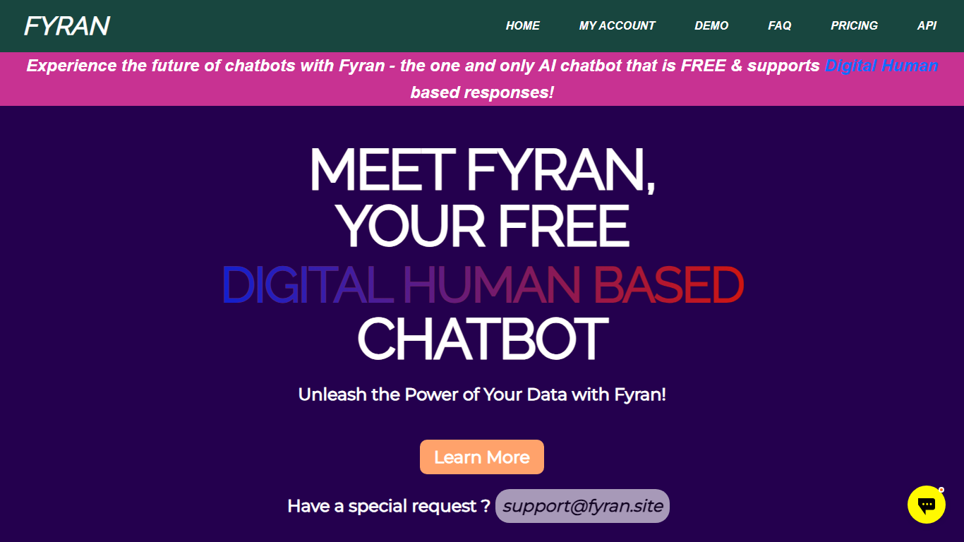 Embrace the next era of chatbot technology with FYRAN — a cutting-edge platform that offers FREE, Digital Human-based responses for an enhanced conversational experience. Perfect for anyone looking to unleash the power of their data, Fyran provides a user-friendly chatbot creation platform that supports a diverse range of input formats, such as PDF, text, MP3, and docx.