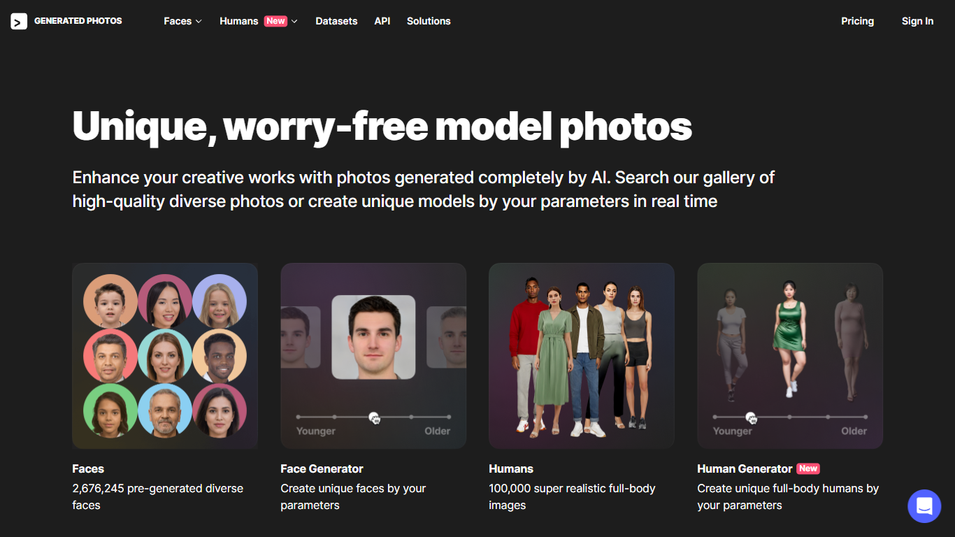 Generated Photos is a website that offers worry-free and unique model photos generated completely by AI. Whether you are a designer, marketer, advertiser, or researcher, you can enhance your creative works with high-quality and diverse photos from Generated Photos. With over 2.6 million pre-generated faces and 100,000 super realistic full-body images, you can easily find the exact look you need or create custom models by your parameters in real time. The photos are perfect for ads, design projects, marketing campaigns, research studies, and machine learning applications. You can also scale up your projects with bulk downloads, datasets, or API integration.