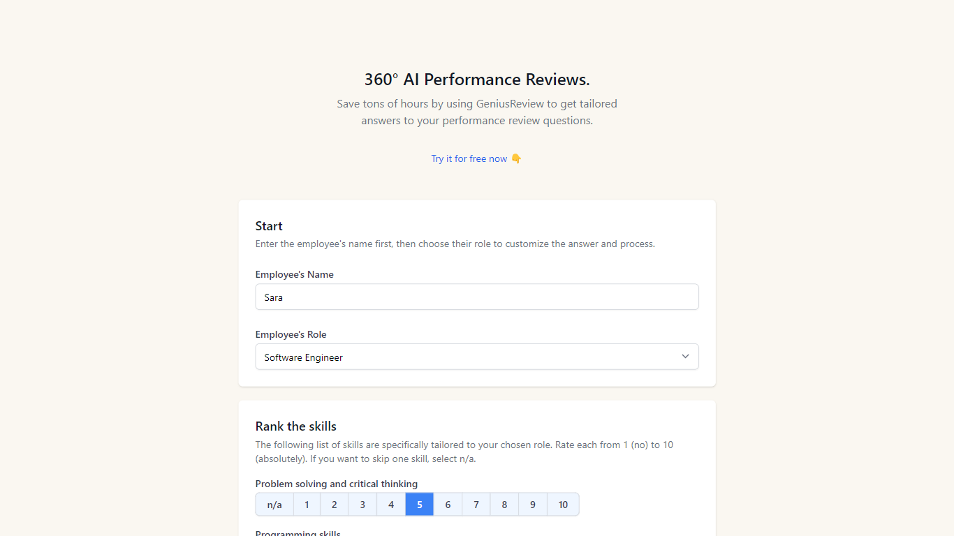 The first step in using GeniusReview is to rank the skills relevant to the employee’s role. Skills such as problem solving and critical thinking, programming skills, communication and collaboration, attention to detail, time management, and adaptability can be rated on a scale of 1 to 10, allowing for a comprehensive evaluation of the employee’s abilities.