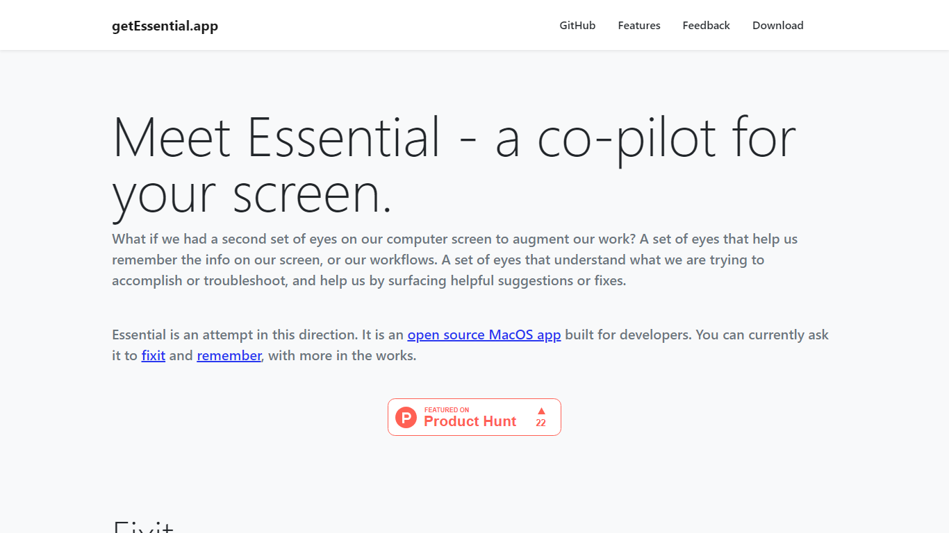 Enhance your productivity with Essential, the innovative MacOS app that acts as a co-pilot for your computer screen. Essential taps into the might of Computer Vision and OpenAI’s LLMs to help developers with real-time troubleshooting and memory assistance, targeting error messages, build failures, and workflow reminders without ever leaving your Mac.