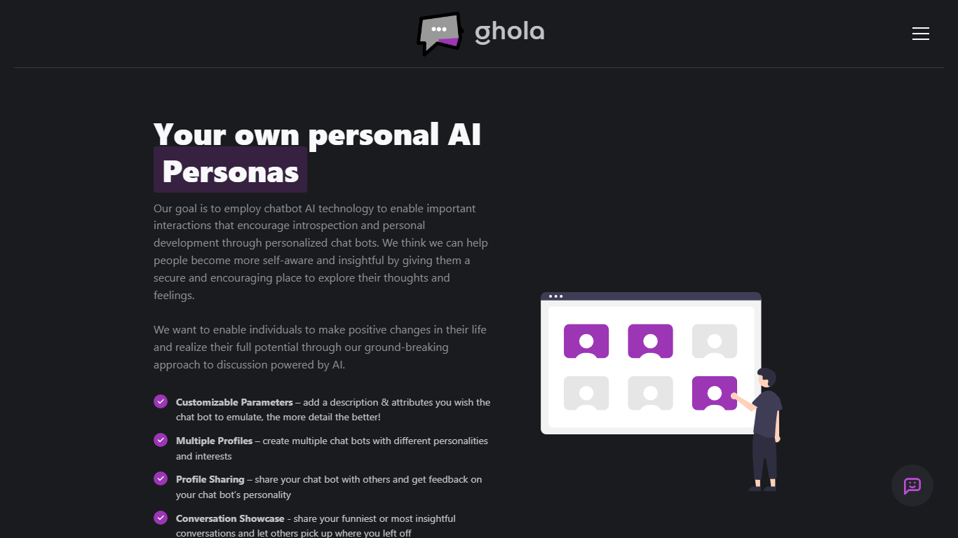 Discover your own personal AI Personas with ghola, a revolutionary platform designed to forge meaningful interactions for personal growth. Utilize our chatbot AI technology to delve into self-exploration and gain deeper self-awareness. Our AI-powered discussions provide a secure and supportive environment to help you reflect on your thoughts and emotions, fostering an insightful journey towards self-improvement.