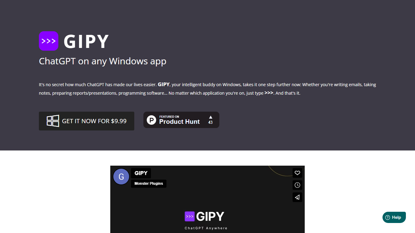 Elevate your productivity with GIPY— the indispensable tool that integrates ChatGPT seamlessly into any Windows application. GIPY is designed to be an intelligent companion for those who want to streamline their workflow across various tasks such as email composition, note-taking, report generation, software programming, and preparing presentations. Simple activation with the ‘>>>’ command brings the power of ChatGPT directly to your fingertips, no matter which desktop application you’re using. This easy-to-use solution will transform the way you work on the Windows platform. Get GIPY today for an introductory price of $9.99 and enhance your efficiency in any application.