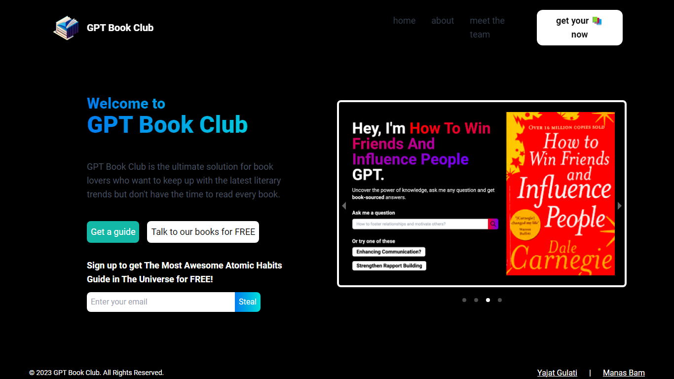 Dive into our extensive catalog and get personalized answers, chapter summaries, and top quotes from a variety of books completely free of charge. Plus, sign up now and receive “The Most Awesome Atomic Habits Guide in The Universe” absolutely free! Join the GPT Book Club today and revolutionize the way you read and discover books.