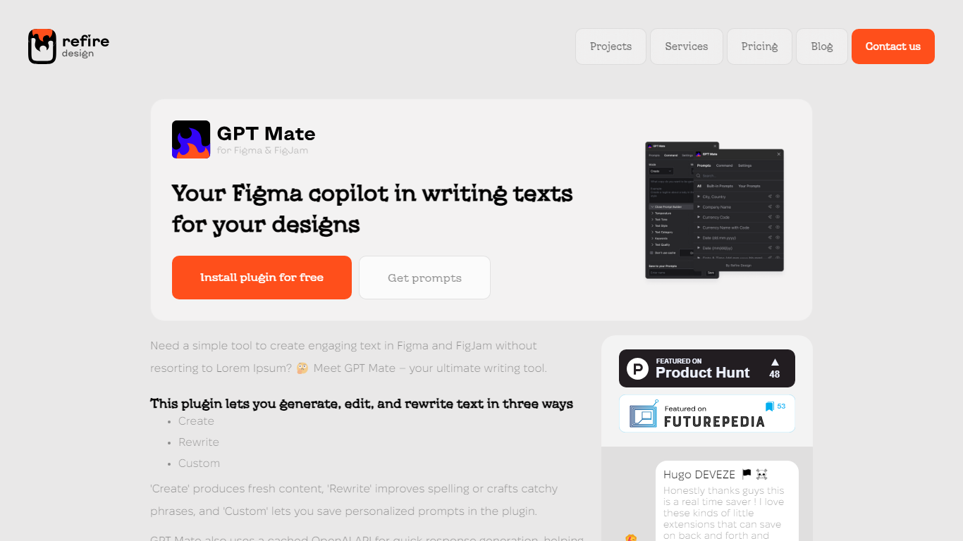 Looking to uplift your design workflow? Discover GPT Mate, the game-changing Figma plugin tailored to revolutionize text generation in your designs. Say goodbye to dull Lorem Ipsum and hello to customized, compelling copy. With GPT Mate, effortlessly generate, edit, and integrate text directly within Figma and FigJam. Perfect for designers and teams, this tool offers versatility through its ‘Create’, ‘Rewrite’, and ‘Custom’ modes, enhancing your creative process like never before.