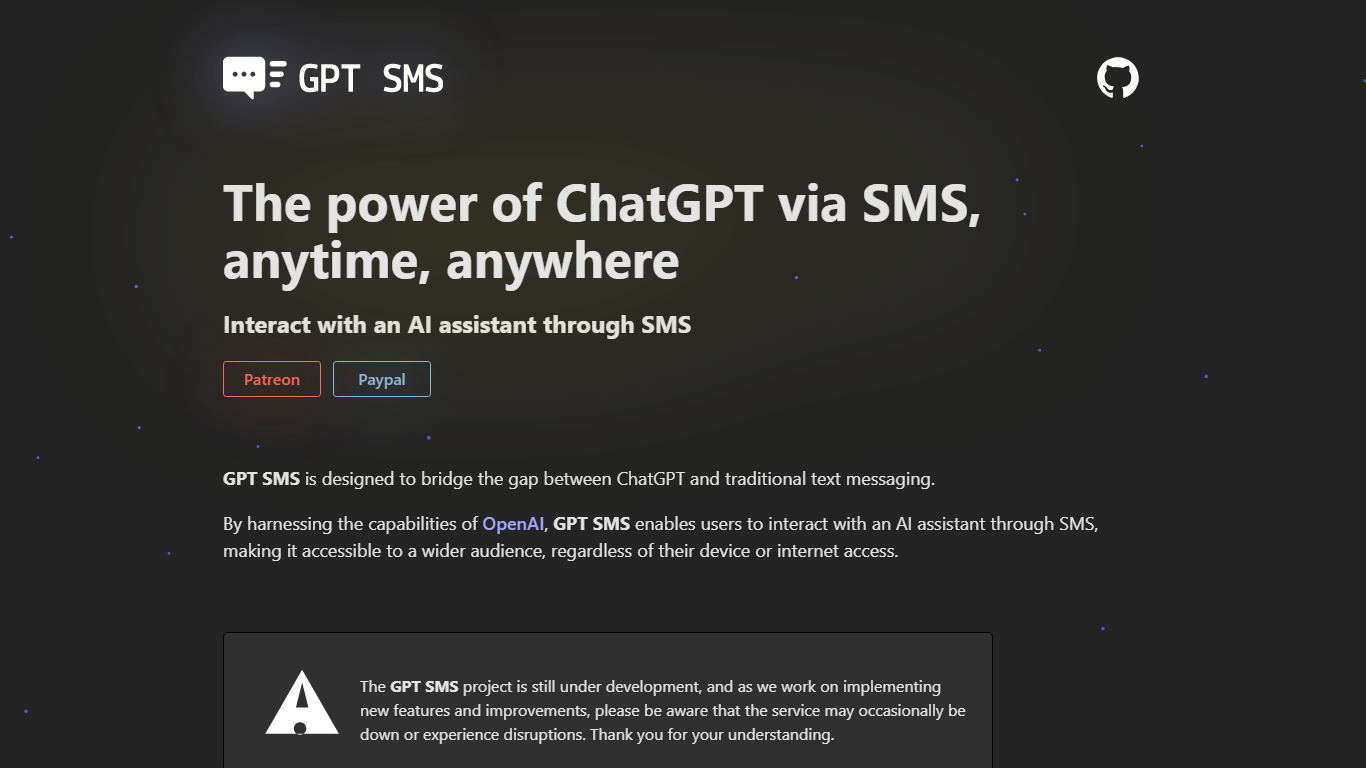 As a project that’s continuously improving, GPT SMS invites you to join us in its development. Your support helps us to enhance our infrastructure, introduce new phone numbers, and deliver an ever-evolving service that’s built for its users. Thank you for your understanding as we grow and refine your AI text-message experience.