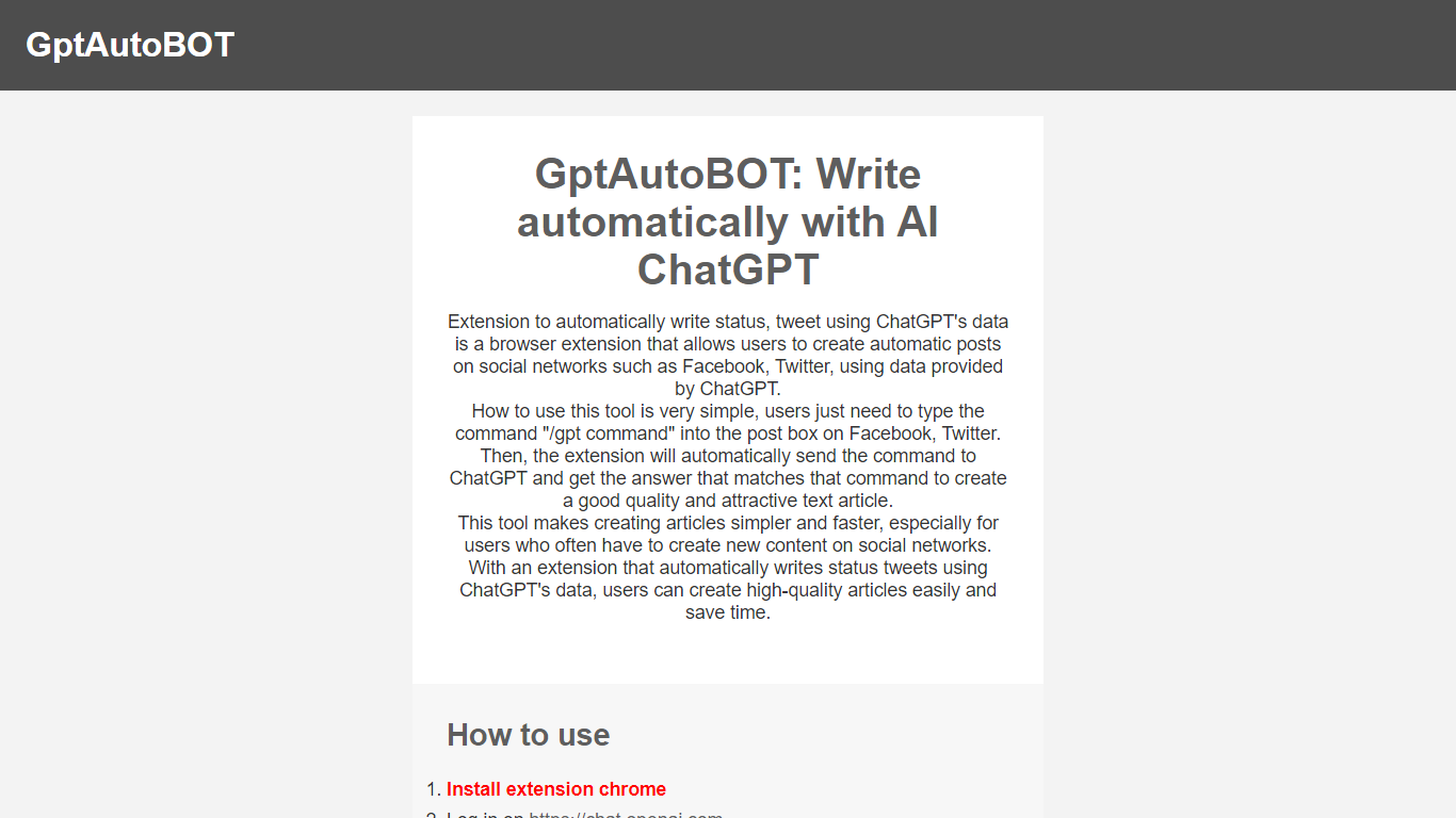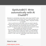 Using GptAutoBOT is a breeze—simply install the Chrome extension, log in at chat.openai.com, and begin crafting your content. By entering “/gpt” followed by your command in any text box, GptAutoBOT takes over, transforming your command into a polished post. This user-friendly extension is perfect for content creators and social media enthusiasts seeking to enhance their online presence with minimal effort.