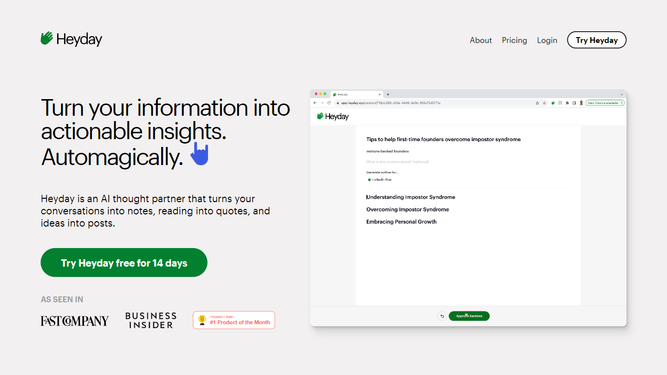 Embark on a journey towards productivity with Heyday – the innovative AI thought partner designed to transform your conversations, readings, and ideas into structured, actionable insights. With the goal of streamlining your workflow, Heyday offers a suite of features that cater to the needs of modern professionals. From instantly generating meeting recap notes to converting extensive reading into memorable quotes and formulating compelling posts, Heyday serves as your assistant in the digital realm. By leveraging advanced AI technology, Heyday ensures that not a single brilliant thought slips through the cracks. Enjoy a 14-day free trial and experience the convenience of Heyday, as it has been lauded by well-known publications like Fast Company and Business Insider. Embrace the future of information management and let Heyday lighten the cognitive load, freeing you up for the work that matters most.