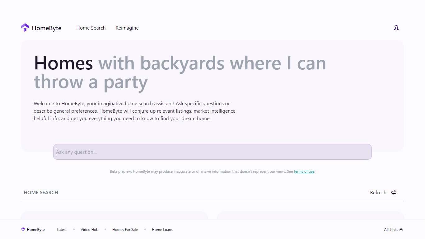 HomeByte is a cutting-edge platform aiming to transform the way you find your dream home. This innovative home search assistant empowers you to discover properties that cater to your unique preferences, whether you’re in search of expansive backyards for festive gatherings or the elegance of vintage homes with modern amenities. With HomeByte, your home search is personalized and imaginative. The service extends beyond mere listings to provide market intelligence, valuable insights, and all the essential information necessary for an informed decision. However, please note that while HomeByte is still in beta preview, there might be occasional inaccuracies or unintentional offensive content, which does not reflect the company’s views. HomeByte’s user-friendly interface is constantly refreshed with the latest on neighborhood insights, real estate trends, educational environments, and financial essentials, ensuring you have access to comprehensive and up-to-date data.