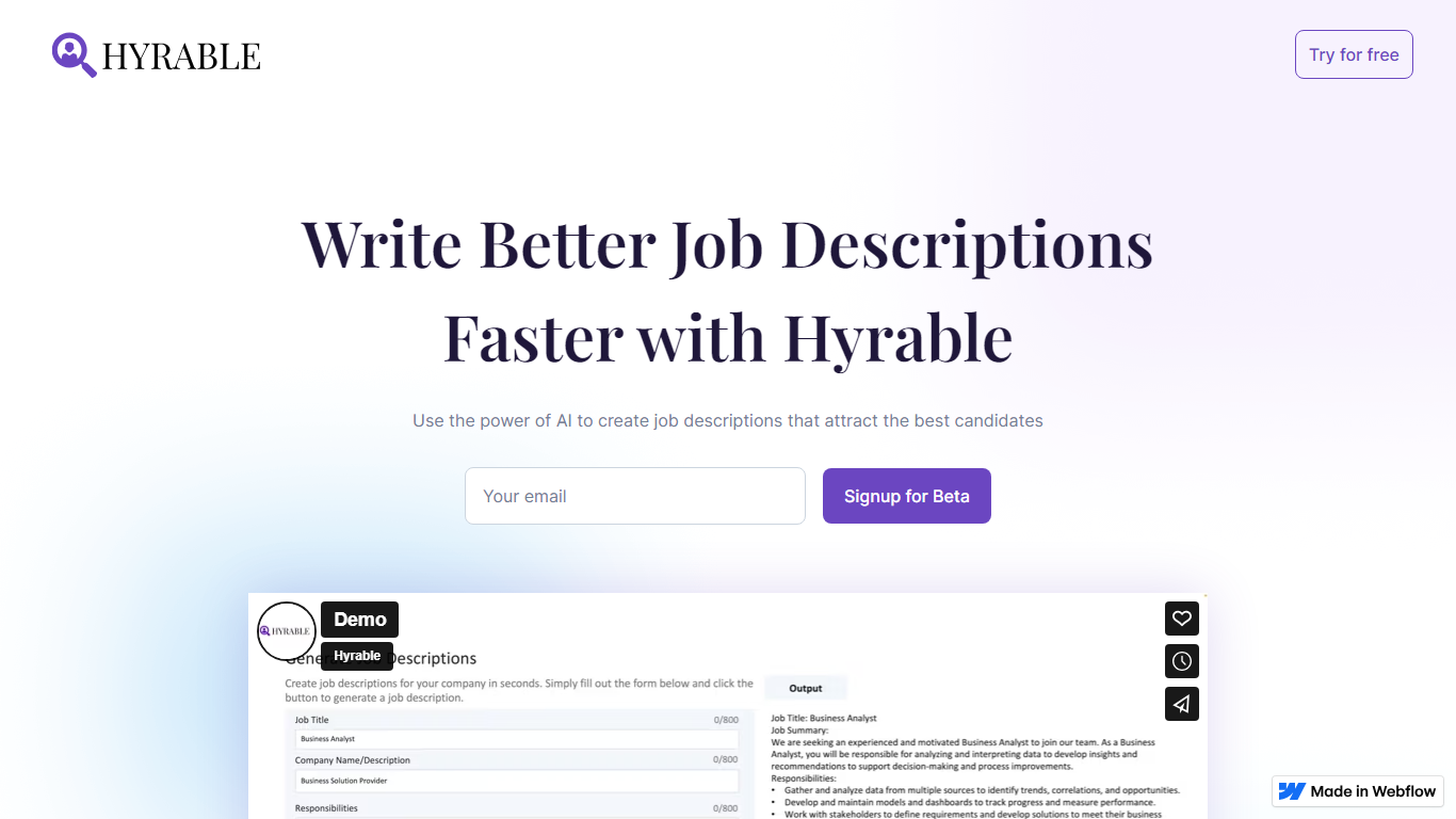Revolutionize your recruitment process with Hyrable’s cutting-edge, AI-powered tools designed to expedite and enhance every aspect of hiring. Our intuitive platform empowers employers to craft compelling job descriptions with unprecedented speed, ensuring you attract the finest talent in the market. Experience the future of hiring with our suite of innovative features, including AI-generated candidate replies, instantaneous interview feedback, and seamless job board integration. With Hyrable, you’ll see a marked increase in candidate attraction, more effective messaging, and a significant reduction in time spent on job postings. Sign up for our waiting list today to be among the first to access our upcoming tools and elevate your recruitment strategy.