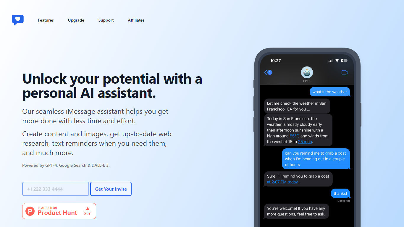 Enhance your productivity with iChatWithGPT.com, the innovative platform designed to bring your personal AI assistant into your daily life. This unique service integrates the latest advancements of GPT-4, Google Search, and DALL-E 3 to offer you a seamless iMessage assistant experience directly from your iPhone or Mac. Whether you’re looking to create captivating content, generate stunning images, or require efficient web research, iChatWithGPT is your go-to assistant. This exceptional tool doesn’t just save time; it ensures that you stay on track with text reminders, enabling you to focus on what truly matters. Experience the future of personalized assistance with iChatWithGPT.com—where your ideas take shape and your tasks are effortlessly managed.