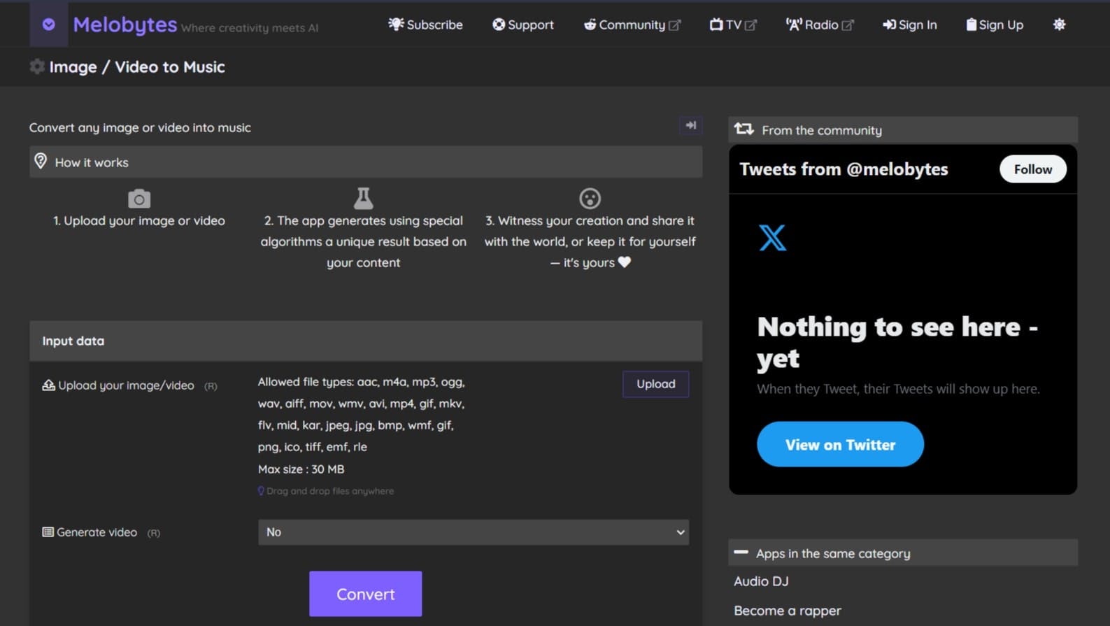 Unlock the potential of artificial intelligence to transform images or videos into unique music with Melobytes.com! At Melobytes, we blend creativity with cutting-edge AI to offer an innovative platform where your media can be given a new life as melodious compositions. Our website is tailored to cater to a variety of creative needs, including music composition, voice composition, algorithmic music, lyric generation, conversions, and more.