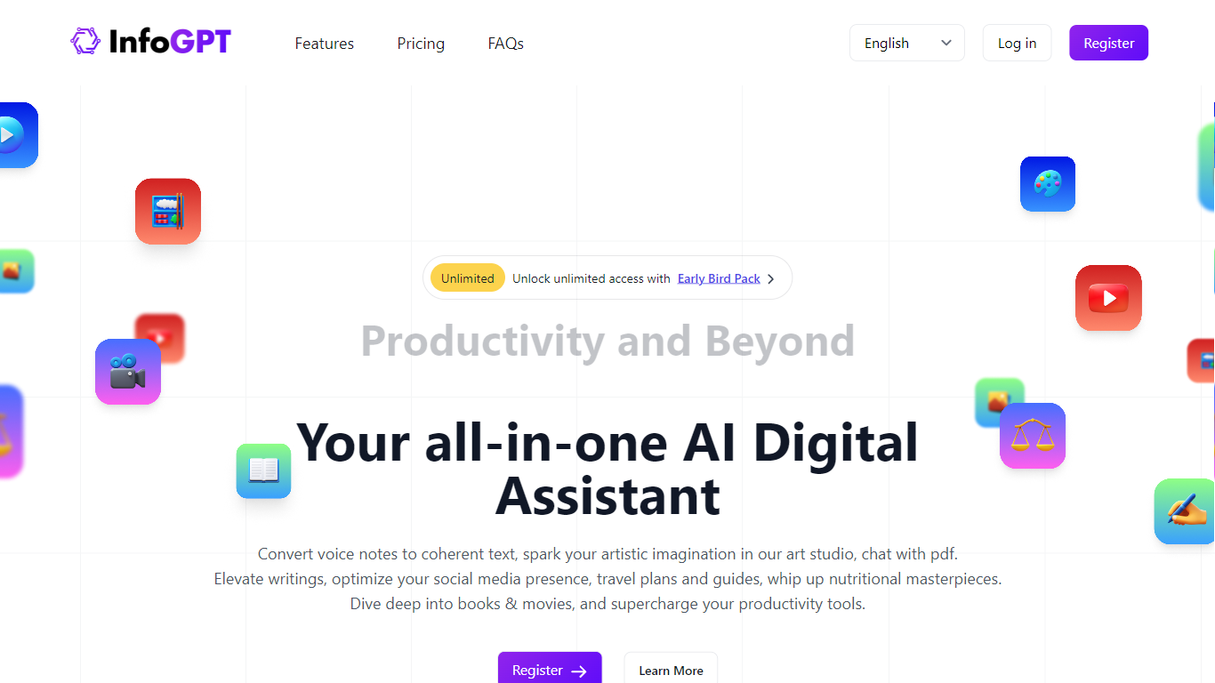 InfoGPT is presented as an all-in-one AI digital assistant designed to elevate digital creativity and productivity. The platform offers a wide range of features aimed at enhancing various aspects of daily life. Users can convert voice notes to text, explore their artistic side in the art studio, and even chat with PDFs.
