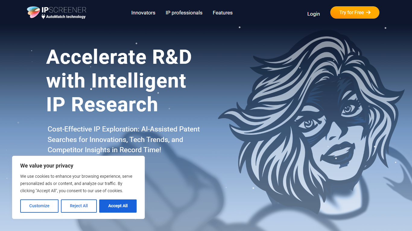 Dive into intelligent IP research with IPscreener’s AI-assisted searches that deliver cost-effective explorations of innovations, tech trends, and competitor insights in record time. Validate your ideas with the confidence that comes from accessing the number one source of business intelligence—patents—now made user-friendly for anyone to understand.