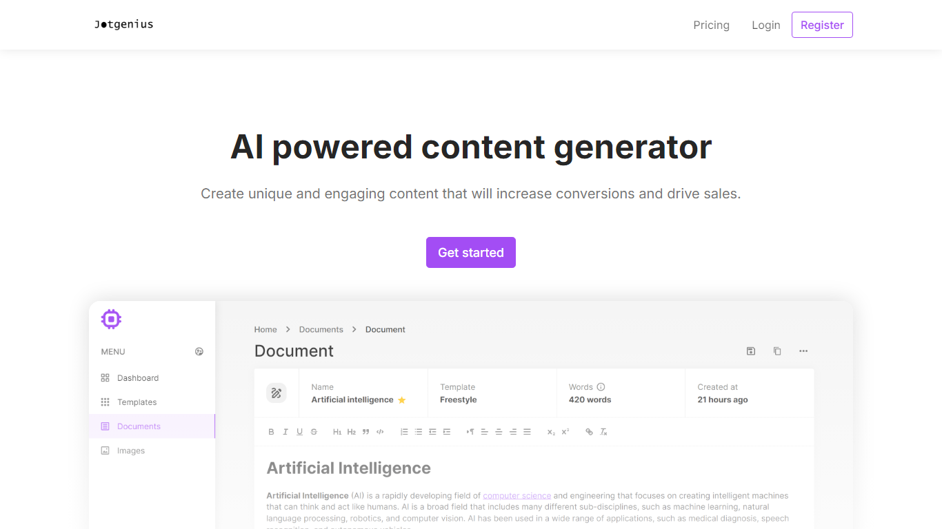 Revolutionize your content strategy with Jotgenius, the AI-powered content generator designed to enhance your digital presence. Unleash creativity and streamline your content production with our diverse range of customizable templates. From crafting compelling articles to designing stunning images, Jotgenius offers a seamless content creation experience to turbocharge engagement and conversions.