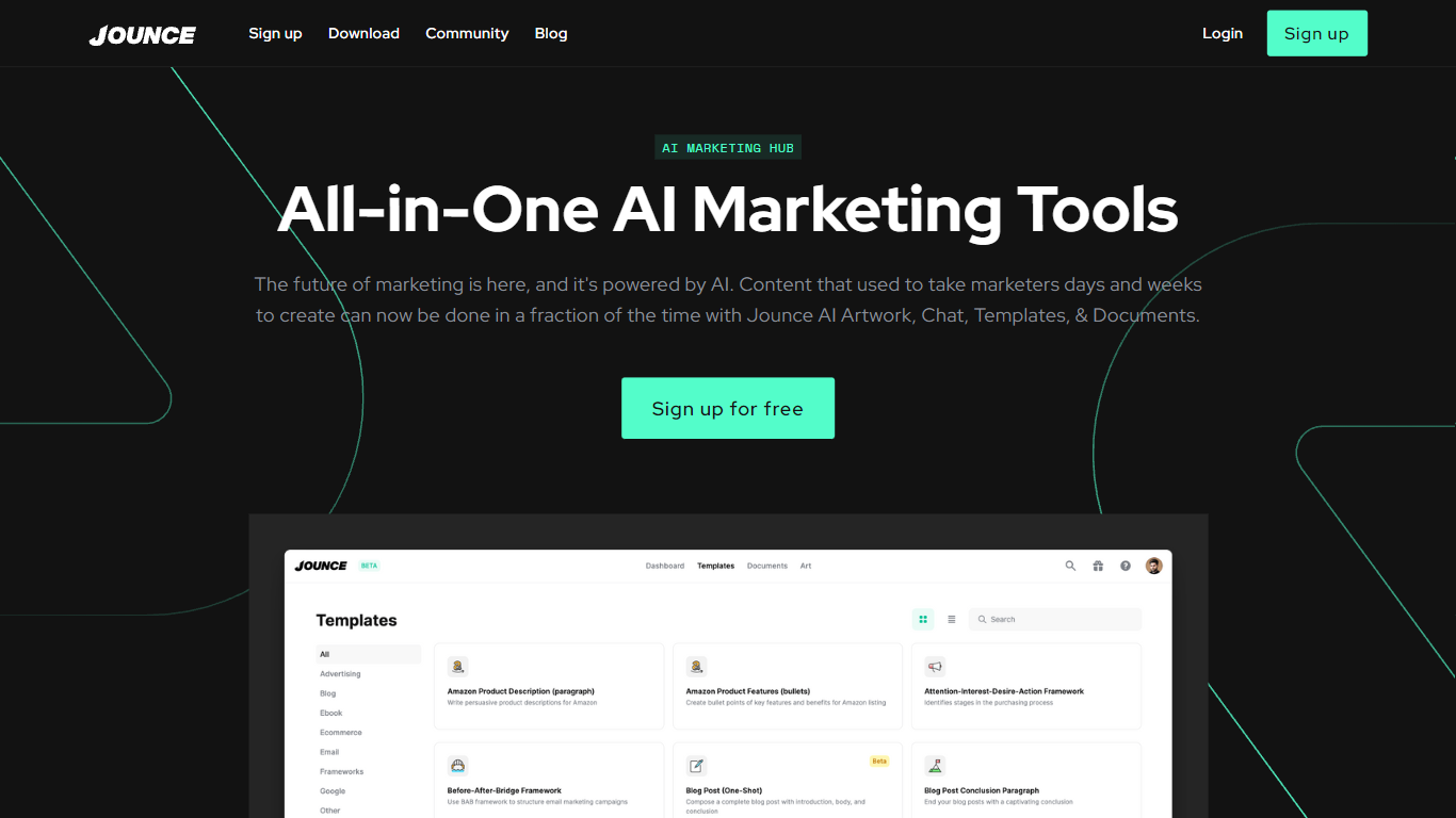 Choose Jounce to boost your marketing output across various channels—blogs, social media, emails, websites, e-commerce, and ads. With over 70 templates to kickstart your campaigns and an infinite array of headline options, Jounce AI understands the intricacies of your industry and is ready to take your marketing strategy to the next level. **Sign up for free** and join over 64,000 marketing teams who’ve chosen Jounce for their marketing needs.
