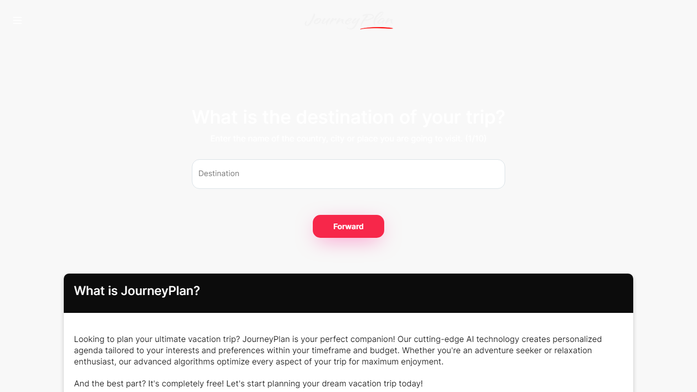 Embark on an unforgettable adventure with JourneyPlan, your ultimate companion for personalized trip planning! This intuitive online platform is designed to craft a tailor-made itinerary that caters to your unique travel preferences. Without the hassle of endless browsing, JourneyPlan streamlines the planning process by asking a series of simple questions, allowing you to create a customized travel experience. Whether you’re deciding on a destination, determining the length of your stay, or selecting accommodations, JourneyPlan has got you covered. Indulge in a culinary journey by specifying your food and drink preferences, and make the most of your trip with tailored activities that match your interests. JourneyPlan even considers your mobility preferences and safety concerns to ensure a smooth and enjoyable trip. Get ready to explore the world your way with JourneyPlan!