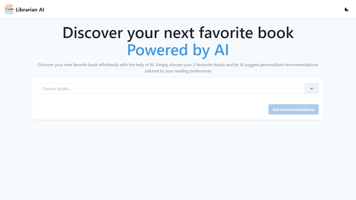 Discover your next captivating book without the hassle of searching. Librarian AI swiftly provides personalized book recommendations with the power of AI, using advanced algorithms to understand your unique reading tastes. Our book recommendation site takes the guesswork out of choosing your next great read, offering a seamless and customized experience. Say farewell to the frustration of endless browsing and prepare to meet your new favorite book. Experience the magic of tailored book suggestions—start your reading adventure with Librarian AI today!
