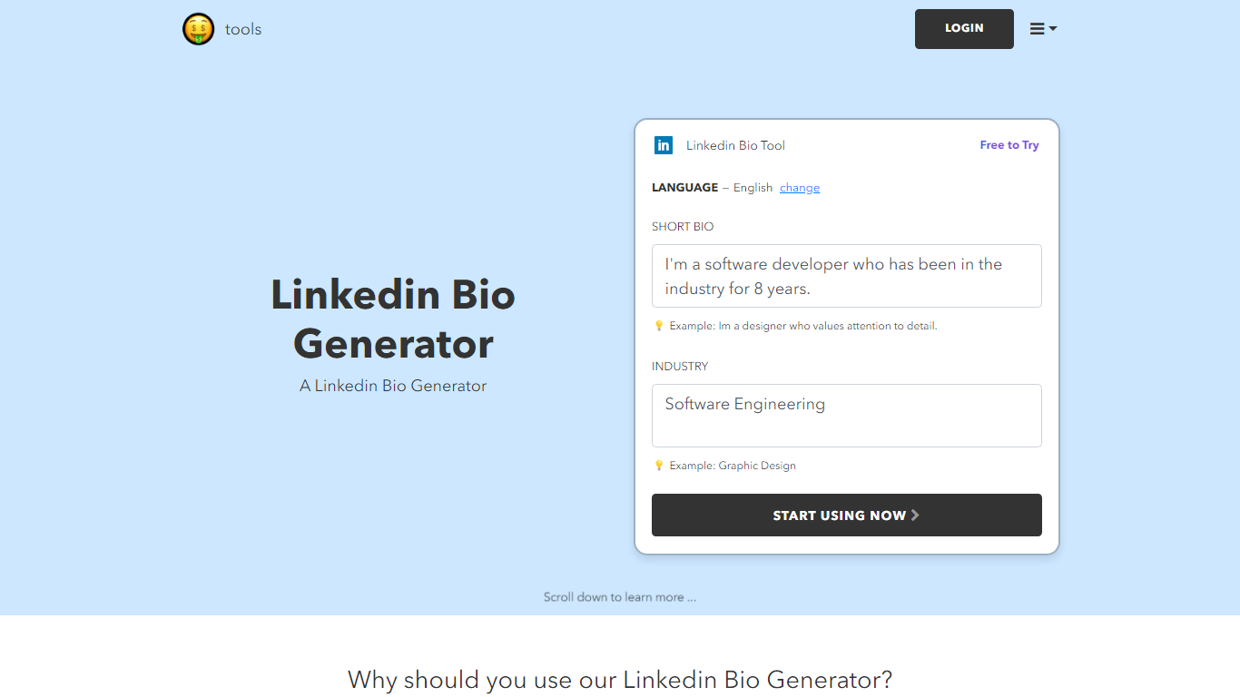 Elevate your professional presence with the nichesss LinkedIn Bio Generator, your go-to solution for crafting a captivating LinkedIn Summary or Bio. Designed to make an impactful impression, this tool efficiently creates an “about me” section tailored to your industry and personal brand. The process is straightforward and AI-powered, ensuring a quick and personalized result. With the nichesss LinkedIn Bio Generator, standing out amongst competition on LinkedIn has never been easier. Start shaping your unique professional narrative today—effortlessly and effectively.