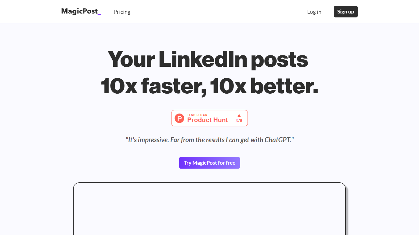 MagicPost is a revolutionary tool that will transform the way you create and publish LinkedIn posts. With MagicPost, you can say goodbye to spending hours on average publications and hello to generating high-quality content 10 times faster and 10 times better.