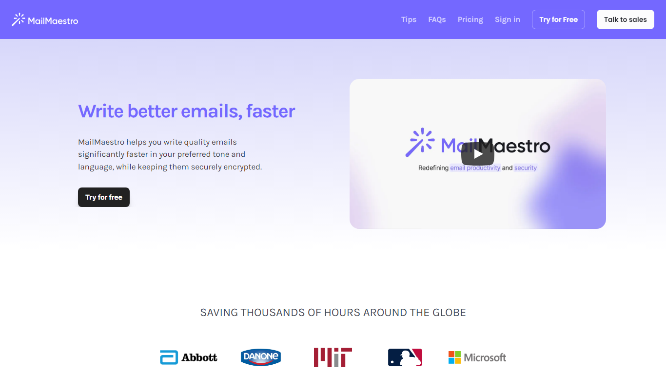 Transform your email writing experience with MailMaestro, the futuristic email assistant powered by OpenAI’s impressive capabilities. This tool is ingeniously designed to help you enhance your email productivity by simplifying inbox management and accelerating the email composition process. MailMaestro stands out with features that allow you to quickly convert simple points into well-crafted emails, personalize your tone and language, and use a user-friendly interface that even learns your unique writing style. Prioritizing security, MailMaestro ensures that your communications are securely encrypted, giving you peace of mind that your sensitive information is well-protected.