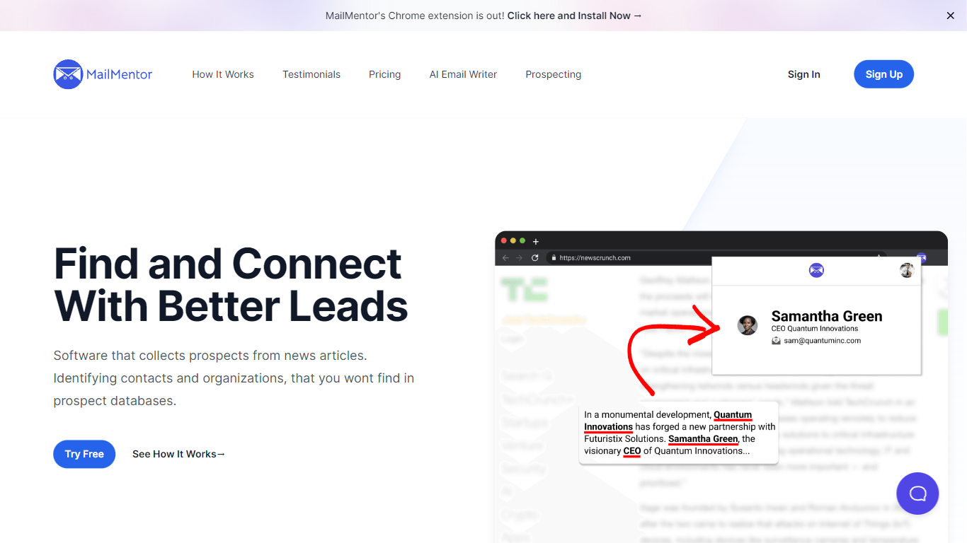 Elevate your lead generation game with MailMentor, the newly launched Chrome extension that puts the power of AI-driven prospecting at your fingertips. Designed for sellers who aim to connect with quality leads, MailMentor scans through news articles and web pages to find contacts and organizations beyond the reach of traditional databases. Its seamless integration into your browser transforms your prospecting workflow, delivering a dashboard of organized contacts ready for engagement.