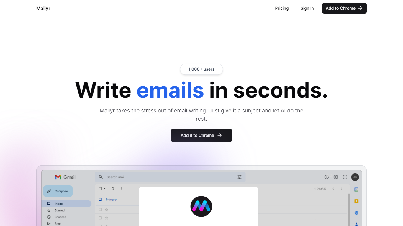 Transform your email writing experience with Mailyr, the revolutionary Chrome extension that lets AI take the wheel. Say goodbye to the stress of crafting the perfect email; with Mailyr, you simply add the extension to Chrome, sign in with Google, and you’re set to go. Craft compelling emails in a fraction of the time by providing a subject, and let Mailyr generate the content for you. Over 1,000 users have already harnessed the power of Mailyr to enhance their email productivity. Accessible via the Chrome browser and integrated with Gmail, Mailyr is like having Gmail with superpowers.