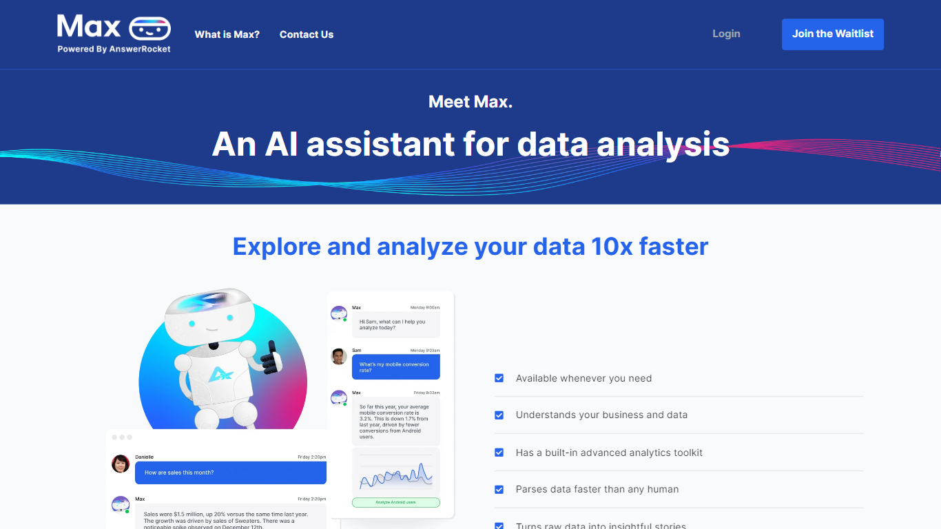 Meet Max, the AI-powered data analysis assistant revolutionizing the way we interact with data. Max is designed to streamline your data analysis workflow, making it faster and more efficient. By harnessing the power of GPT-3.5 Turbo and AnswerRocket’s advanced analytics toolkit, Max offers real-time insights and turns complex data sets into comprehensible stories. It comprehends your business needs and proactively suggests analyses, often uncovering valuable insights you might overlook. Experience rapid data parsing and say goodbye to time-consuming data analysis processes. Whether you want quick answers from your data on-the-go or in-depth analyses, Max is your agile partner in data-driven decision making. Its user-friendly interface makes exploring data as easy as having a conversation, ensuring you’re never more than a few clicks away from the information you need.