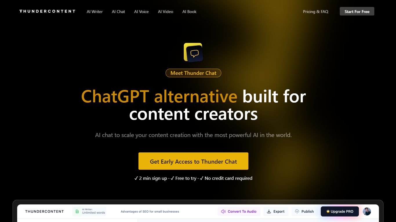 Thundercontent presents itself as a potent ChatGPT alternative specifically tailored for content creators. Drawing from a vast online database that includes billions of articles, forums, and video transcripts, Thunder Chat empowers users to generate knowledgeable and niche-specific content with ease. Standing apart from ChatGPT which possesses knowledge up until 2021, Thundercontent offers the unique advantage of integrating real-time data directly from Google, enabling writers to include the most current topics in their work. Supporting collaboration among team members, the platform encourages synchronous content creation while also featuring a user-friendly text editor for refining the output. One notable offering is the availability of services in over 140 languages, catering to a global user base and facilitating communication in a user’s native tongue. Additionally, the platform promotes originality by assisting users in crafting unique and applicable content swiftly, thanks to the capabilities of artificial intelligence.